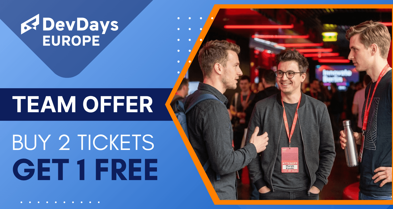 High-performing teams grow together. With our exclusive 3-for-2 group deal, DevDays Europe 2026 makes it easier than ever to upskill your entire team. Secure three full-access passes while paying for only two and unlock three conferences under one ticket. Split sessions, share insights, and return with practical strategies that move your organization forward.
